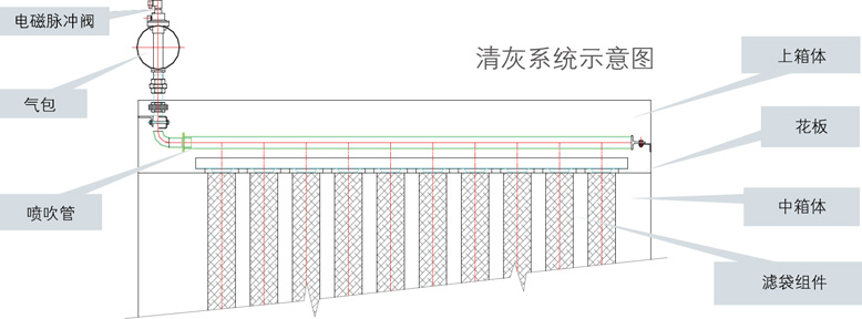 The filtration method of the high-efficiency low-pressure pulse bag dust collector with the functions of offline dust cleaning and offline maintenance (that is, non-stop maintenance) and fixed tube spray dust cleaning technology is external filter type, that is, the dust-containing gas is outside the filter bag. The filtered clean gas is inside the filter bag and discharged through the exhaust main pipe.