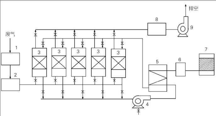 1 - 过滤阻火器;2 - 气流分布器;3 - 吸附床;4 - 热风机;5 - 换热器 6 - 预热室;7 - 催化燃烧床;8 - 集气器;9 - 排风机