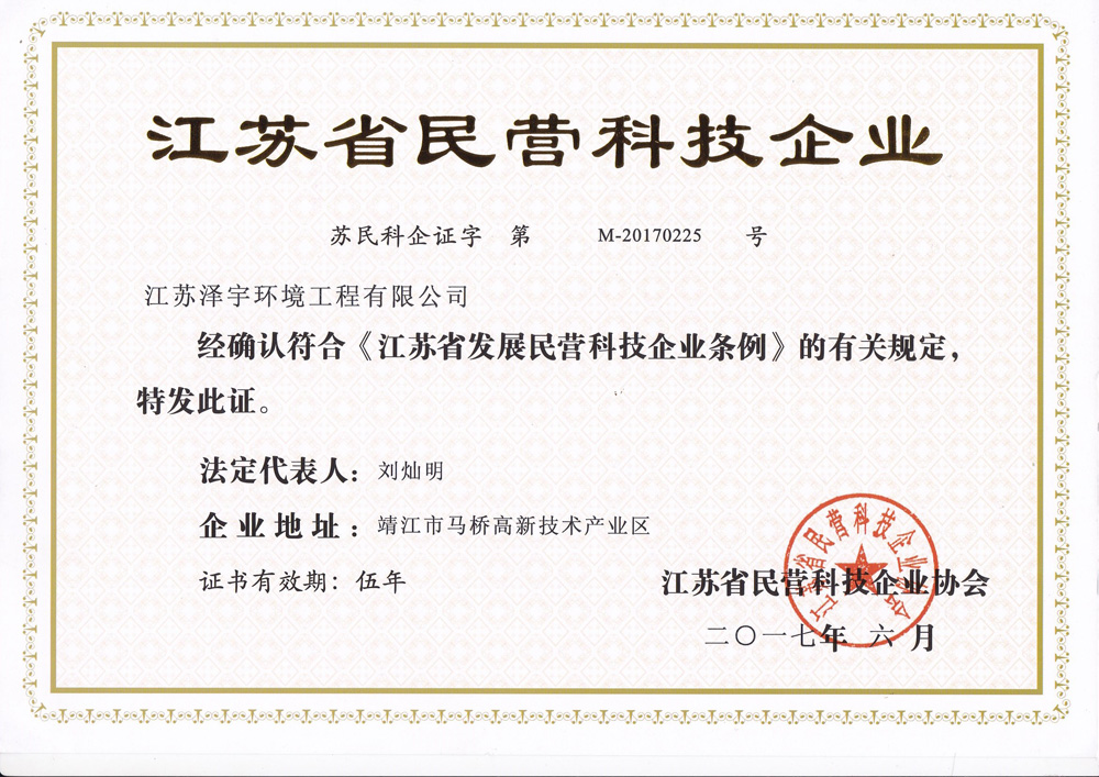 民营科技企业是党和政府对企业的关心,所颁发的荣誉,证明了企业在科技发展道路上,通过自主经营、技术开发,取得了客户和社会的认可。江苏泽宇环境工程有限公司于2017年获得“民营科技企业”的称号,不仅增加了企业的美誉度,还增强了客户对企业的信心,从而使企业在市场上更有份量和含金量,为企业发展如虎添翼。